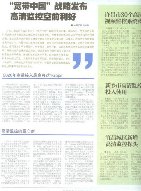 國(guó)務(wù)院印發(fā)“寬帶中國(guó)”戰(zhàn)略及實(shí)施方案,提出到2015年,要基本實(shí)現(xiàn)城市光纖到樓入戶、農(nóng)村寬帶鄉(xiāng)入村,固定寬帶家庭普及率達(dá)到50%。該戰(zhàn)略的提出為民用的普及解決了一大難題,也是民用高清監(jiān)控領(lǐng)域的一個(gè)催化劑。